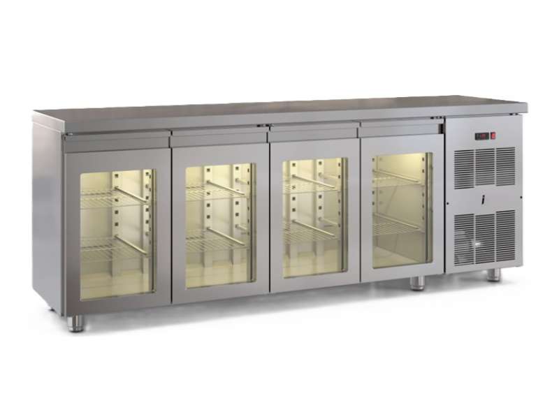 Επαγγελματικό ψυγείο πάγκος συντήρηση με 4 γυάλινες πόρτες GN από ανοξείδωτο χάλυβα.