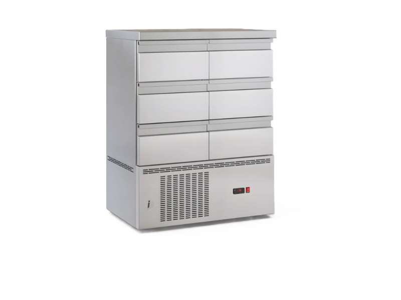 Επαγγελματική αποθήκη ψαριών συντήρηση με μηχανή κάτω στατικής ψύξης με 6 συρτάρια απο ανοξείδωτο χάλυβα.