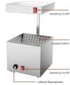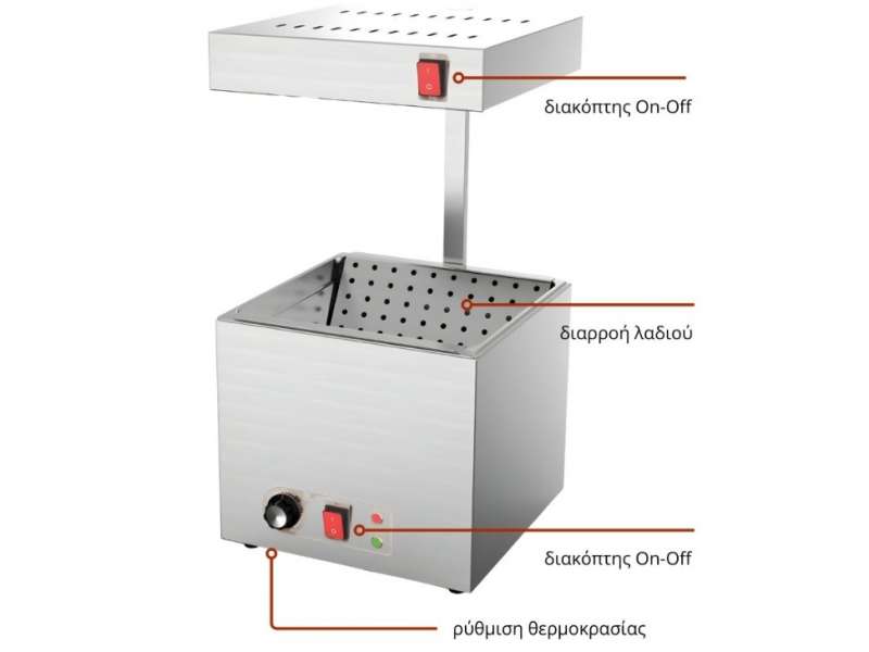 Επαγγελματικός θερμαντήρας πατάτας για κάθε κουζίνα fast food ή εστιατορίου. Απαραίτητη συσκευή για να παραμένουν οι τηγανητές πατάτες ζεστές και τραγανές για μεγάλο χρονικό διάστημα. Η στιβαρή ανοξείδωτη κατασκευή του εγγυάται μέγιστη αντοχή και εύκολο καθαρισμό, ενώ τα αντιολισθητικά πόδια προσφέρουν απόλυτη σταθερότητα κατά τη χρήση. Εξοπλισμένος με προηγμένο σύστημα θέρμανσης επιτυγχάνει ομοιόμορφη κατανομή θερμότητας από 30°C έως 90°C. Διαθέτει δύο διακόπτες On-Off και θερμοστάτη για ακριβή ρύθμιση της θερμοκρασίας. Μεγάλη χωρητικότητα και εργονομία για άψογο σερβίρισμα.