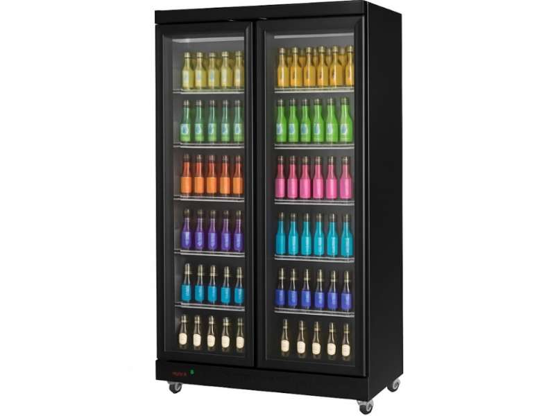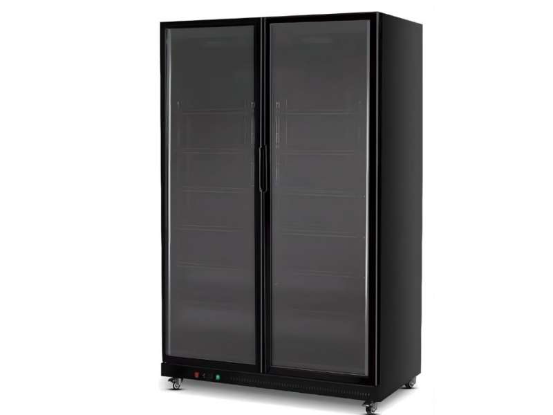 Επαγγελματικό ψυγείο μαύρου χρώματος με διπλή πόρτα για μέγιστη απόδοση και εντυπωσιακή προβολή προϊόντων. Διαθέτει διπλό τζάμι ασφαλείας LOW-E για κορυφαία θερμομόνωση και εξοικονόμηση ενέργειας. Ο εσωτερικός φωτισμός LED αναδεικνύει το περιεχόμενο, ενώ ο ψηφιακός ρυθμιστής θερμοκρασίας με οθόνη προσφέρει ακριβή έλεγχο. Η λειτουργία βεβιασμένης ψύξης εξασφαλίζει ομοιομορφία στη θερμοκρασία. Στα πλεονεκτήματα περιλαμβάνονται ο συμπυκνωτής χωρίς ανάγκη συντήρησης, η αυτόματη απόψυξη και το σύστημα αυτόματου κλεισίματος πόρτας για απρόσκοπτη λειτουργία και ευκολία στη χρήση. Πρόκειται για μία στιβαρή και αξιόπιστη λύση για κάθε επαγγελματικό χώρο.