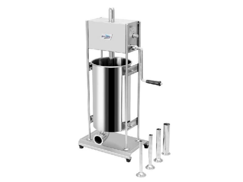Κάθετη κατασκευή για χειροκίνητο γέμισμα, στιβαρό μηχάνημα, εύκολο στη χρήση. Αποτελεσματικό εργαλείο για τη γέμιση κάθε είδους λουκάνικου. Κύλινδρος από ανοξείδωτο ατσάλι, πιστόνι αλουμινίου εγκεκριμένο για τρόφιμα με ειδικό φινίρισμα, γρανάζια ακριβείας και ανθεκτικής κατασκευή εξαρτημάτων για ομαλή λειτουργία, μέγιστη απόδοση και μεγάλη διάρκεια ζωής. Ιδανικό για κρεοπωλεία. Συνοδεύεται από 4 χωνιά σε διαφορετικά μεγέθη (10-20-30-35mm).
