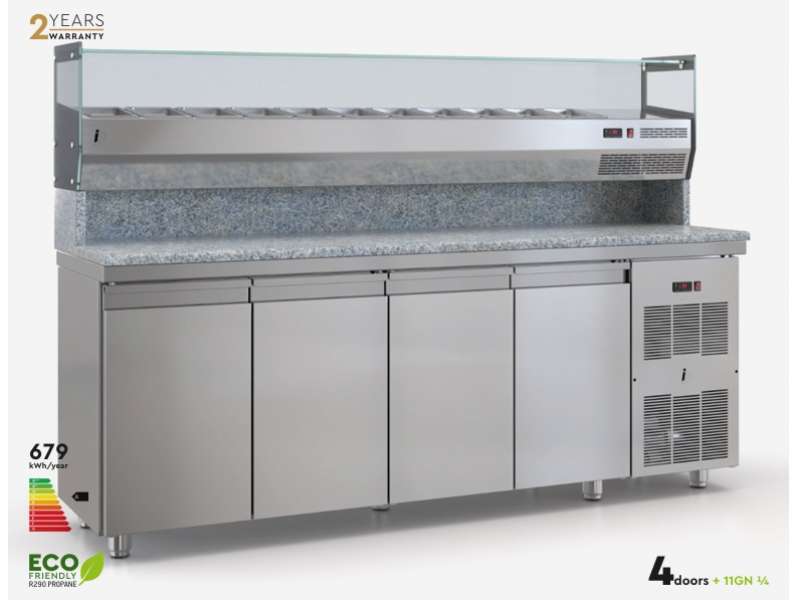 Ψυγεία πίτσας συντήρηση με επιτραπέζιο set-up για 11 GN 1/4, με γρανίτη και μηχανή.