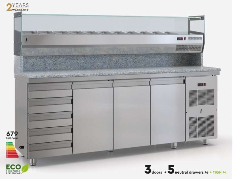 Ψυγεία πίτσας συντήρηση με επιτραπέζιο set-up για 11 GN 1/4, με γρανίτη 5 ουδέτερα συρτάρια και μηχανή.
